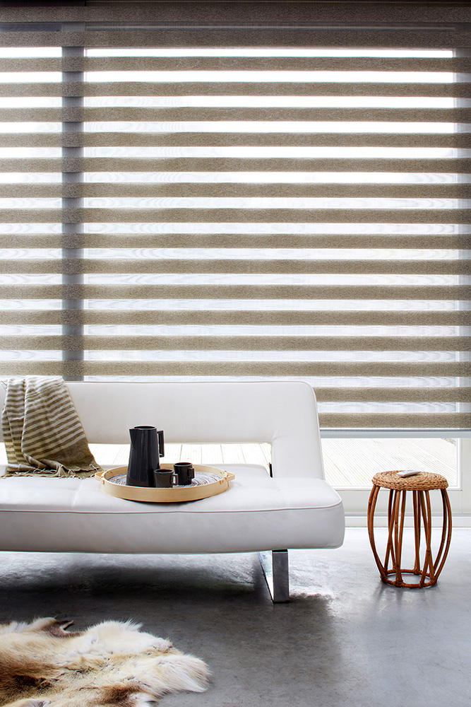 À mi-chemin entre le store enrouleur et le store vénitien, le store Duoroll se distingue par ses deux couches de tissu mobiles composées de bandes horizontales transparentes et opaques. En ajustant leur superposition, vous modulez la lumière selon vos envies, tout en conservant une esthétique contemporaine et élégante, parfaitement adaptée aux intérieurs modernes.